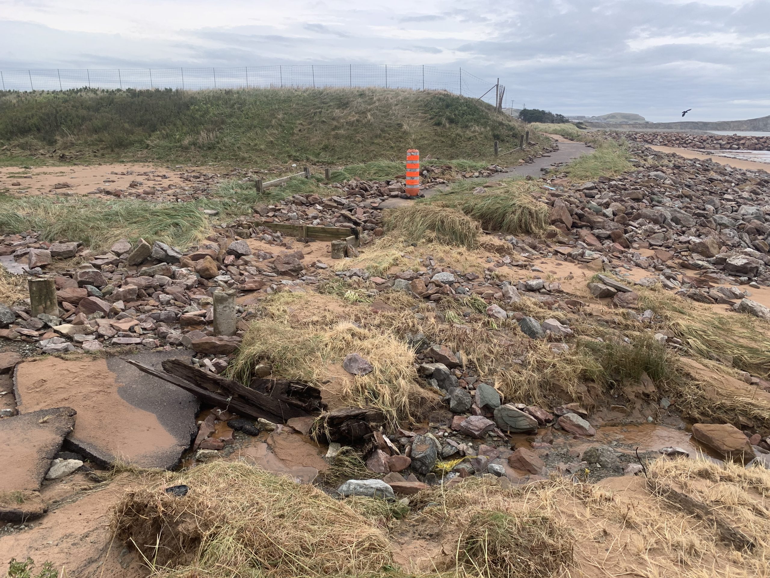Fiona a lourdement détruit l’ouvrage de protection ainsi que la piste cyclable sur une distance d’environ 40 mètres. Les pierres ont été dispersées partout dans la zone autour du ruisseau et de l’ancien pont, alors que ce dernier a été emporté par la mer à près de 150 mètres à l’intérieur des terres. Le niveau d’eau extrême durant la tempête Fiona a submergé le secteur.