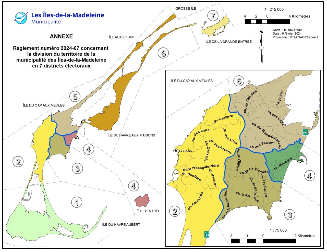 Le 9 avril 2024, la Municipalité des Îles-de-la-Madeleine a adopté le Règlement nº 2024-07 concernant la division du territoire de la Municipalité des Îles-de-la-Madeleine en 7 districts électoraux. Cette division du territoire est différente de celle qui était en vigueur lors des élections précédentes et s’appliquera lors de l’élection municipale du 2 novembre 2025.