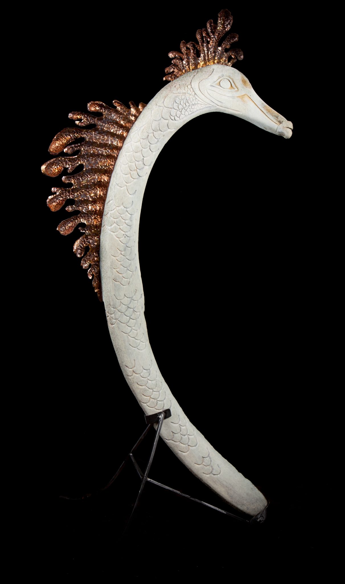 La côte de baleine a été récupérée sur un rorqual commun échoué à Grande-Entrée. Cette œuvre faisait partie d’un corpus d’œuvres exposé au Musée de la mer en 2014. L’exposition s’intitulait « De cuivre et d’os, ostéologie débridée et revisitée des mammifères marins »